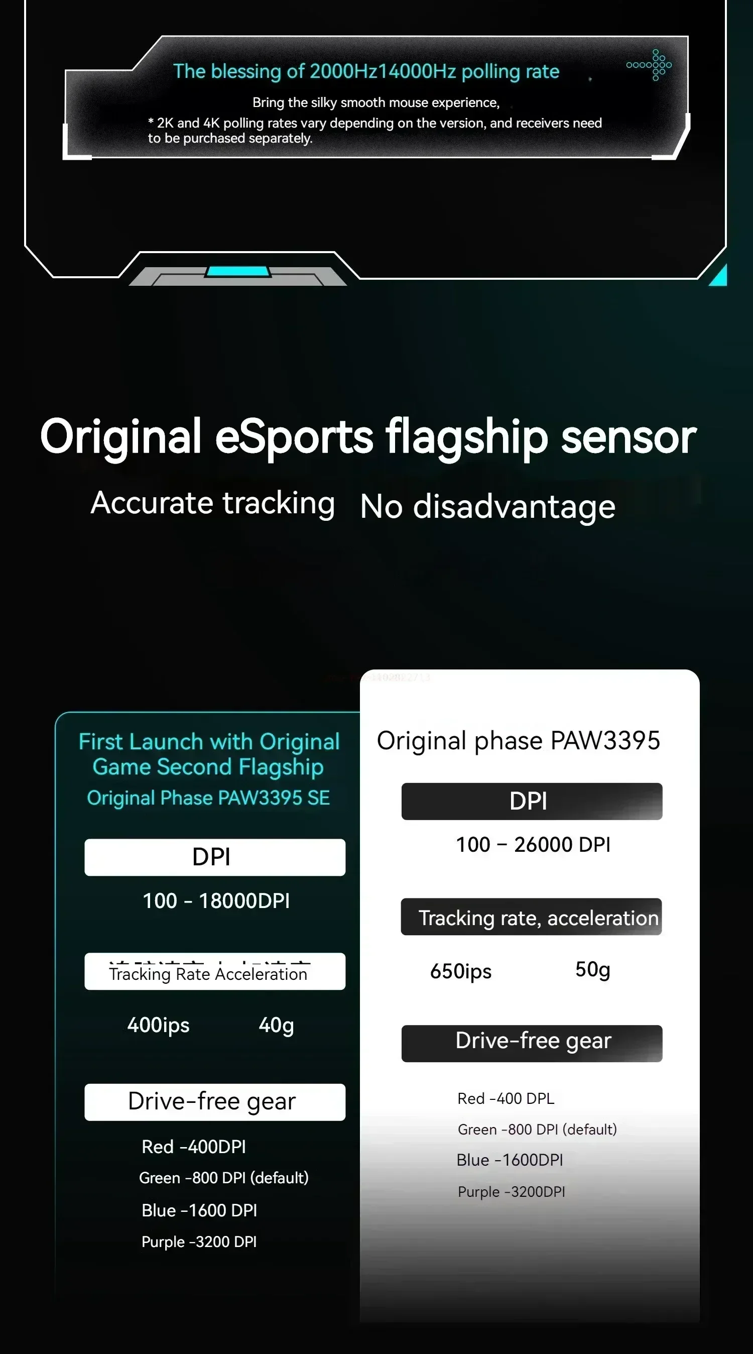 - SENSOR — PAW3395/SE: An esports flagship sensor with powerful optical tracking performance, perfect for esports scenarios.