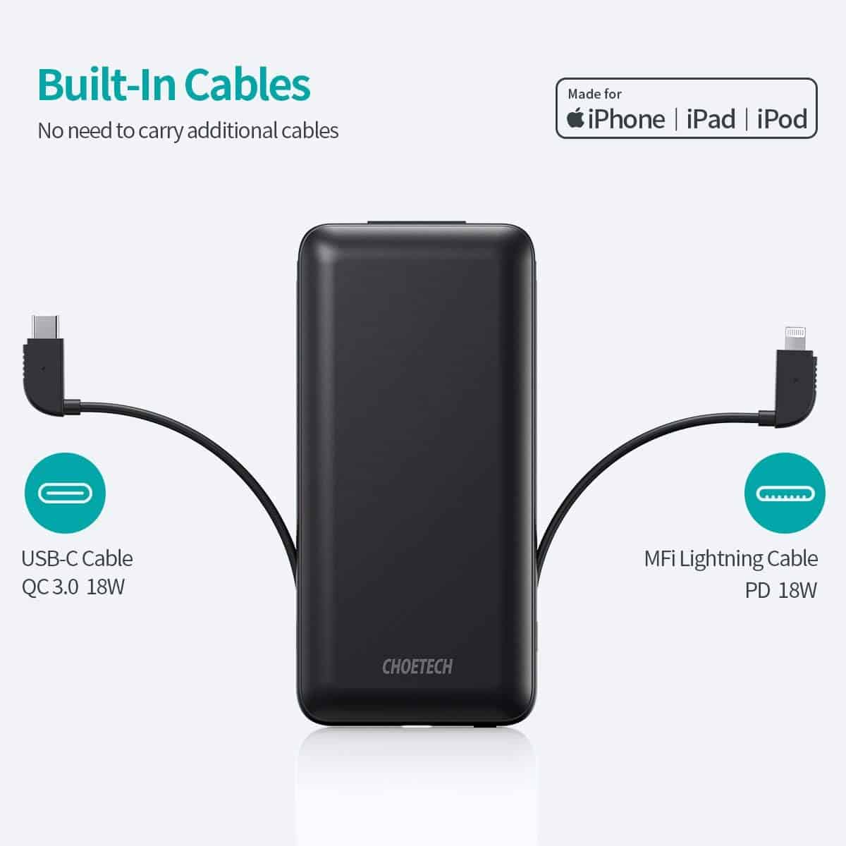 Choetech’s power bank with two built-in cables – one MFi-certified PD18W Lightning cable and one QC3.0 18W USB-C cable allows you to charge two devices at the same time, providing enough power for iOS and Android phones and tablets. You don’t need to take additional cables when you’re on-the-go.