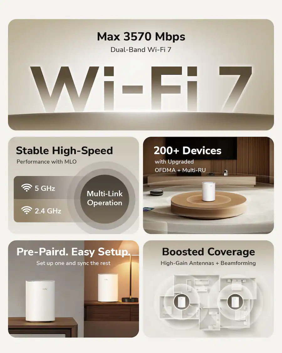 – Next-Gen Wi-Fi 7 Performance – Dual-band Wi-Fi 7 with up to 3.6 Gbps total speed for ultra-fast home networking.