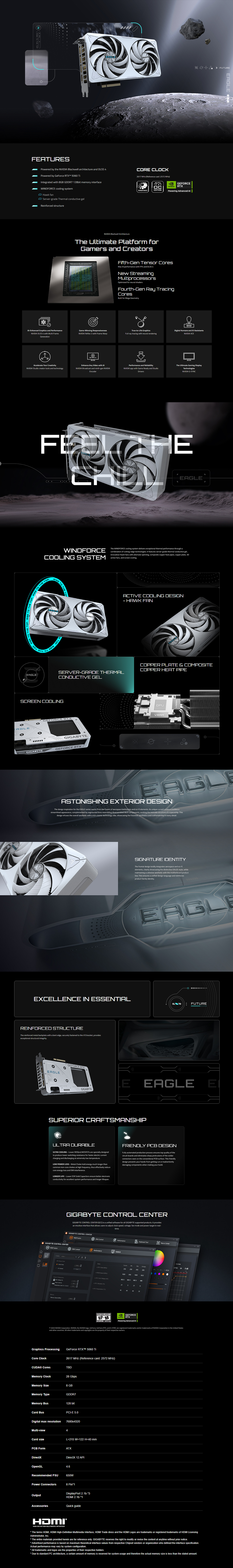 The WINDFORCE cooling system delivers exceptional thermal performance through a combination of cutting-edge technologies. It features server-grade thermal conductive gel, innovative Hawk fans with alternate spinning, composite copper heat pipes, copper plate, 3D active fans, and screen cooling.