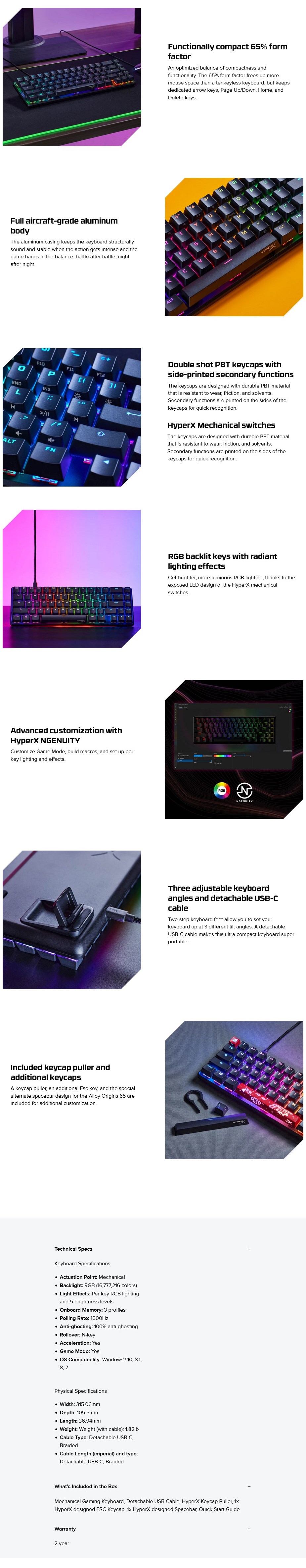 The HyperX Alloy Origins 65 is a balanced keyboard which blends compactness and functionality, but compromises nothing. A 65% form factor makes it more compact than a tenkeyless keyboard, while still offering arrow keys. With a durable, full aluminum body, and balanced HyperX switches rated to withstand 80 million keypresses, it’s as reliable as it is compact. The stock double shot PBT keycaps have the keys’ secondary functions printed on them so you can quickly locate any additional functionality you need. Let your style shine bright with the HyperX switches’ exposed LED design, and stunning lighting effects. Further customize your keyboard with macros, personalized lighting profiles, and more with HyperX NGENUITY software.