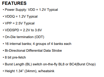 DDR4-2400 timing of 17-17-17 at 1.2V. Each 288-pin DIMM uses gold contact fingers. The JEDEC standard electrical and mechanical specifications are as follows: