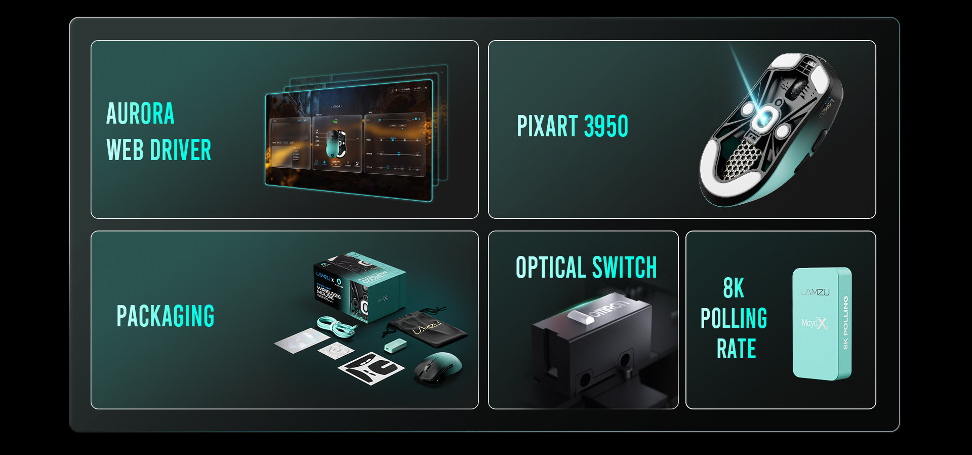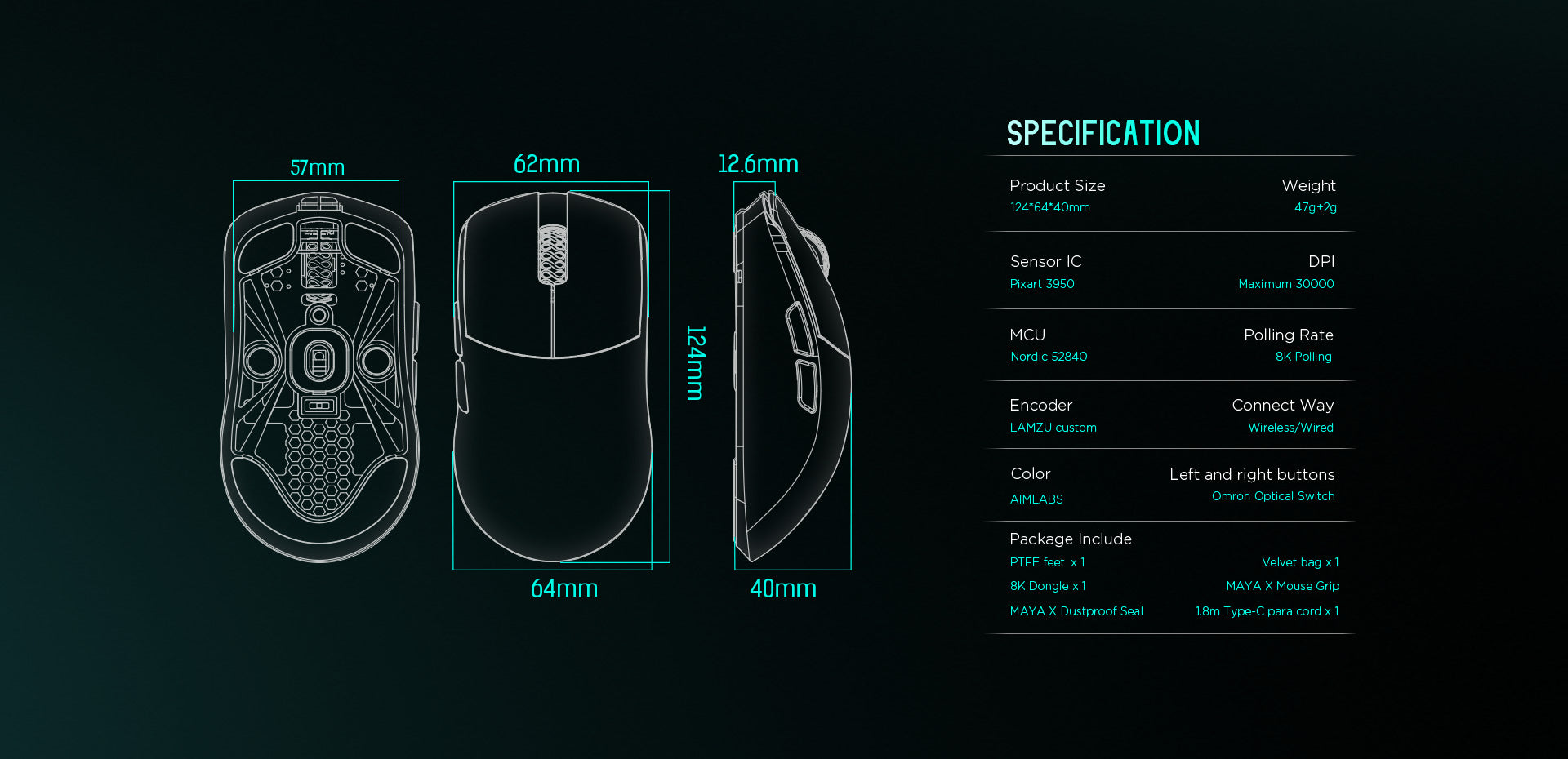 - Weighing just 47g, the MAYA 8K mouse is designed to be lightweight yet sturdy, providing ultimate comfort during long gaming sessions.