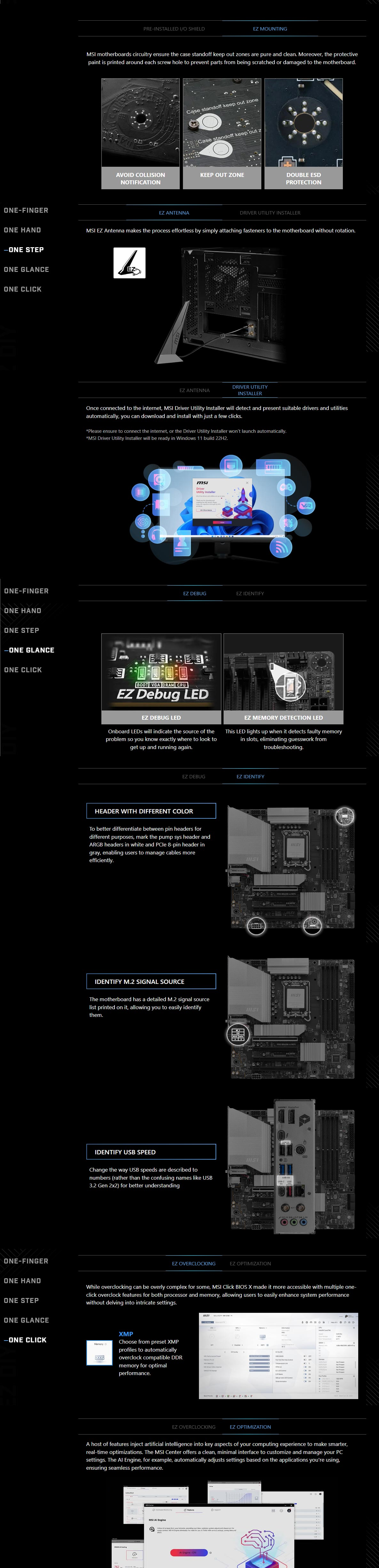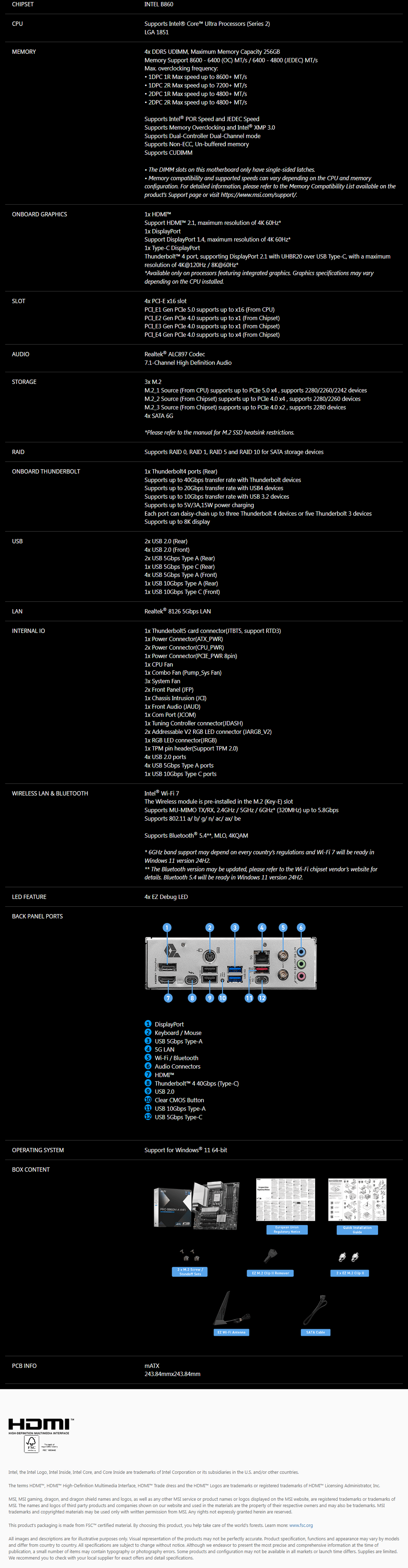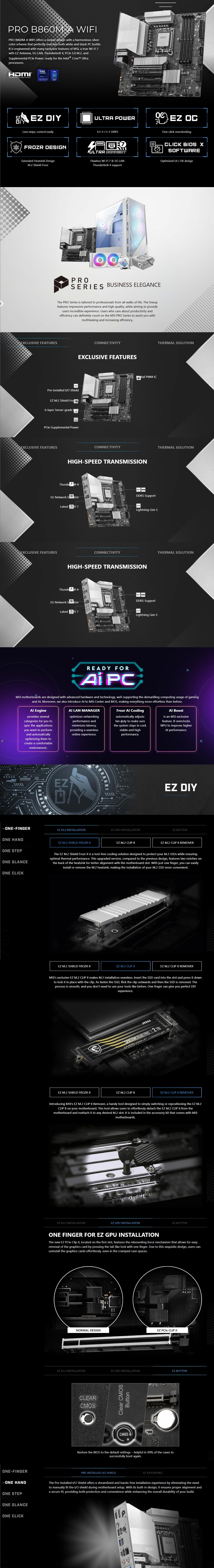 PRO B860M-A WIFI offers a simple design with a harmonious silver color scheme that perfectly matches both white and black PC builds. It is engineered with many exclusive features of MSI, a true Wi-Fi 7 with EZ Antenna, 5G LAN, Thunderbolt 4, PCIe 5.0 M.2, and Supplemental PCIe Power, ready for the Intel® Core™ Ultra processors.